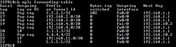 MPLS confuses many people because of its amorphous place in the OSI model. MPLs officially is a layer 2.5 protocol because Layer 3 protocols can be encapsulated in MPLS. MPLS stand for Multi Protocol Label Switching. MPLS can carry many different Layer 3 protocols inside it, just as ethernet a layer 2 protocol can carry TCP/IP inside its frames. However MPLS is more complicated than that. Many people can easily be confused because MPLs depends on the routing table in order to function, in this sense you could think of it like a layer 4 protocol. MPLS cannot function if the routing table is not working. MPLS depends on LDP or the Label Distribution Protocol to form adjacencies with neighbors and distribute its list of labels as well as receive labels from peers. LDP forms adjacencies at the layer 3 level and used the routing table to find peers. LDP is similar to OSPF in that is uses the highest Loopback address to identify itself. In our network Diagram each switch has a loopback address. All of the P routers including the PE routers are running OSPF. This OSPF instance is advertising the subnets owned by the ISP, many ISP’s use ISIS for this purpose, in fact many ISP’s use private addresses in their network especially if there network is a transit network. There are many situation in which you have public IP traffic traversing a private network connecting another public network. The 3 P routers and 2 PE routers need to know how to get to all of the non public IP addresses that the ISP is using to connect their network together. OSPF is used to synchronize these addresses as well as advertise each routers loopback address. Once all routers have formed neighbor relationships and all routes have been distributed through OSPF LDP is able to use the routing table to form adjacencies with other routers using their loopback addresses.