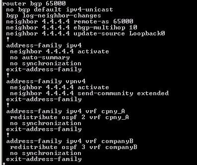 Now that the OSPF adjacency is up with the customer you should be able to see a list of the routes under that VRF. The next step is to establish a BGP neighbor relationship with the other PE routers in the ISP or a Route Reflector depending on the size of the environment. Once the BGP relationship is established, the only thing you have to do is redistribute the OSPF routes into BGP and vice versa under the appropriate OSPF Instance.